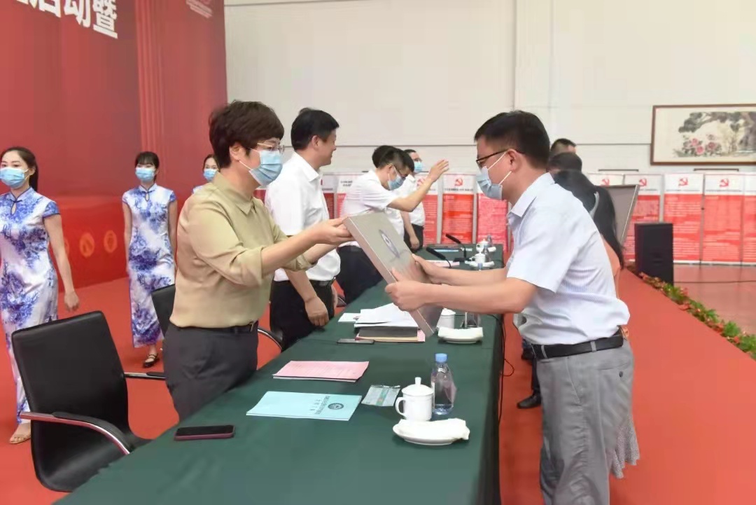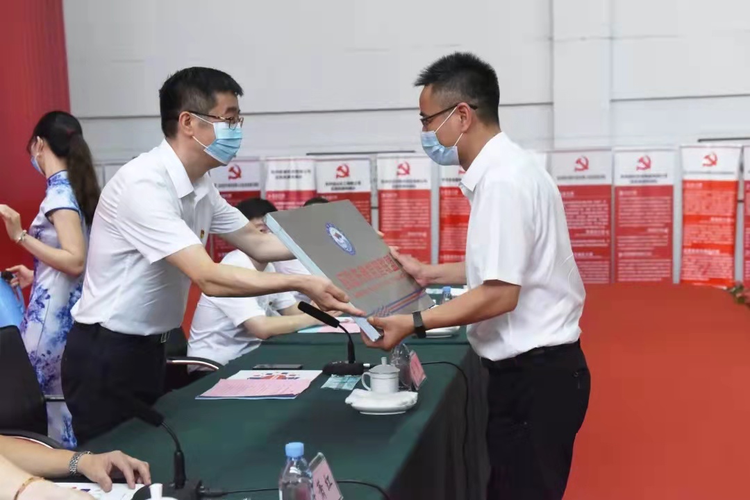 吳勇、徐進、葉蕭紅、施正森、蔣慧兒分別向杭州電化集團有限公司、浙江巴陵恒逸己內(nèi)酰胺有限公司、浙江鼎龍科技股份有限公司、杭州海潮橡膠有限公司、杭州吉華江東化工有限公司五家企業(yè)授“應(yīng)急先鋒黨建聯(lián)盟成員單位”銘牌。